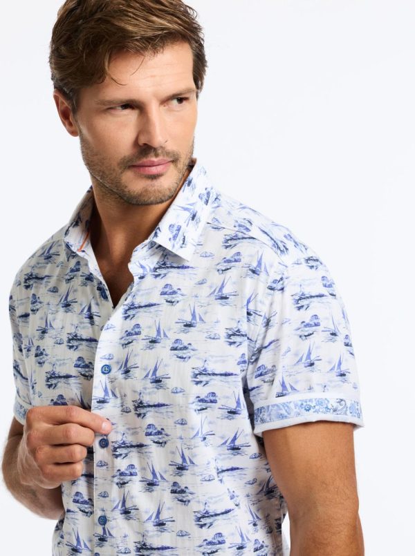 A blue and white sailboat print across this short sleeve style exudes calming vibes. The sketch-like design brings an almost whimsical feel to this classic shirt. Don’t miss the floral print at the inside neck for a chic finishing touch. Note: This style is slightly fitted. It is tailored for a closer-to-the-body fit, with all the RG personality you expect.