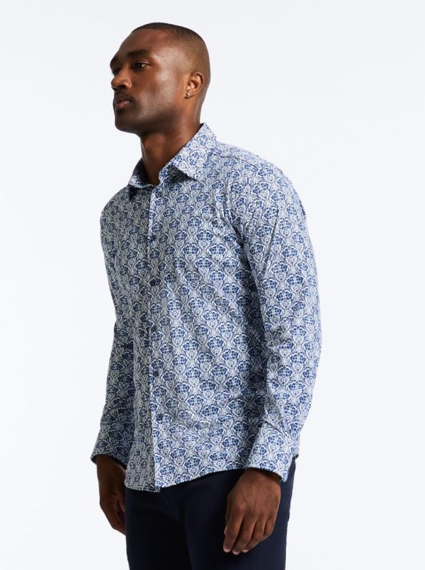 This geometric print will have everyone coming in for a closer look. A garden of blue buds is abloom all across this monochromatic style. The nylon motion knit fabric gives you performance on the go.