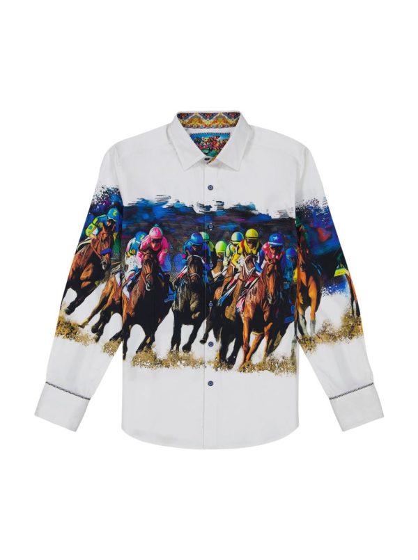 It’s derby day and you’ll be dressed to impress in this equestrian style. The vibrant print across the front center features colorful jockeys racing towards the finish line. Roll the cuff and find them galloping by in a flurry of multi-hued patterns. A race check print lines the cuff and the derby scene art patch at the back yoke.