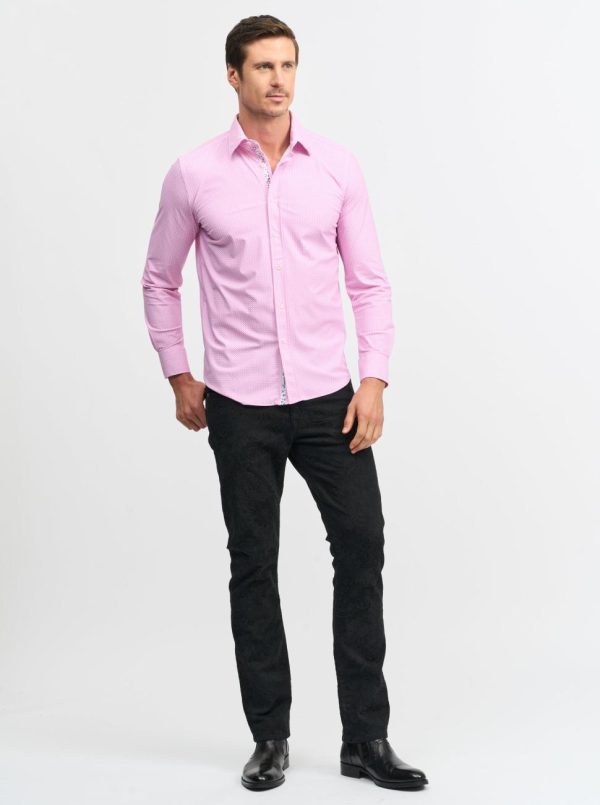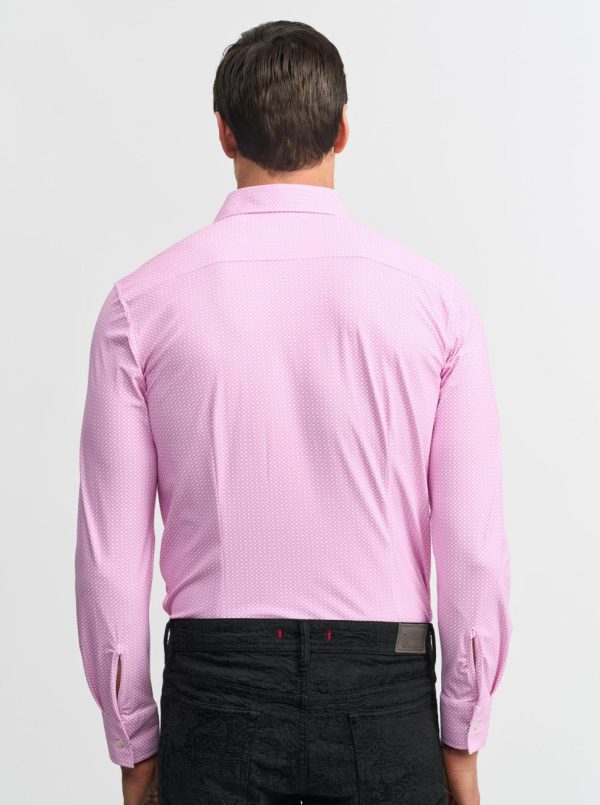 Update your office attire with this twist on workwear shirts. A micro pattern adds interest without overwhelming, and the stretch in the fabric provides all-day comfort. You’ll love the breathability of this button down style in our knit motion nylon fabric. Layer under a blazer or wear solo with dark wash denim to complete the look.