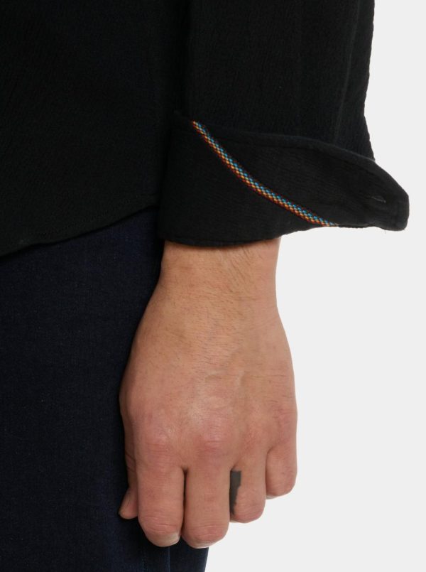 - Multi-colored trim at placket, and cuff