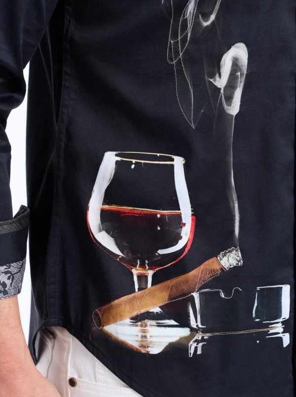 —a perfect blend of comfort and cool. This classic shirt touts a meticulously detailed cigar with swirling smoke that gracefully drifts over a stylish drink, a nod to those who know the value of a well-earned break. The design playfully captures the spirit of taking a moment for yourself: “Take a break from the fast life and pour yourself another.” The Mancave encapsulates the spirit of relaxation and camaraderie.