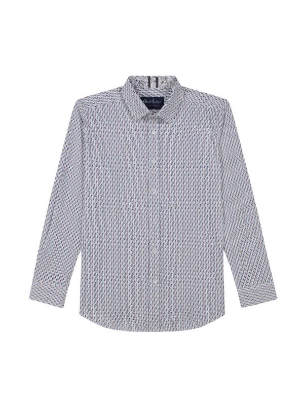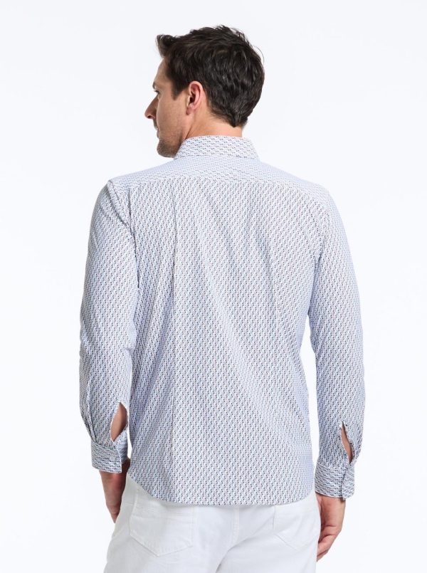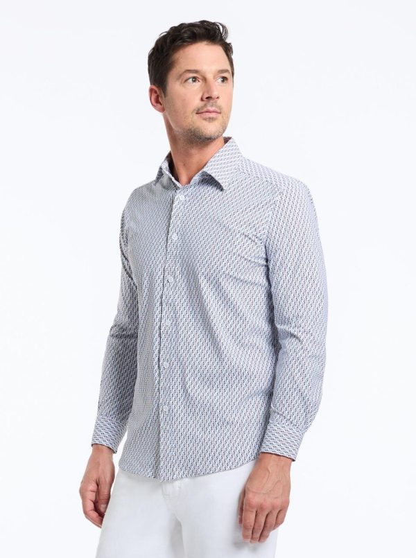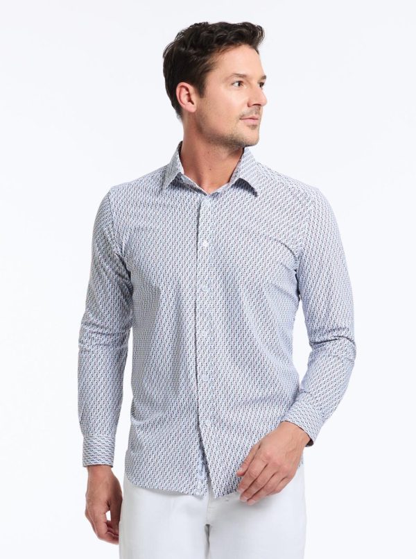Upgrade your workwear attire with this office-ready style. Look closely and notice the micro print that lends a retro vibe to this button down. Feel the comfortable stretch and all-day breathability in our knit motion nylon fabric that make this shirt perfect no matter where the day takes you. Pair with khakis or dark wash denim to complete the look.