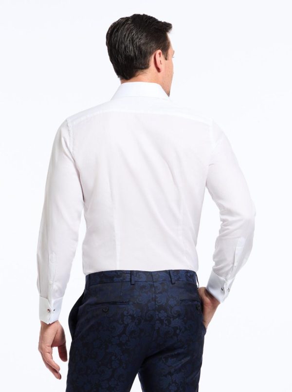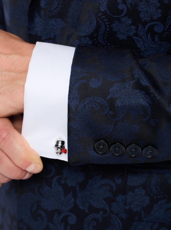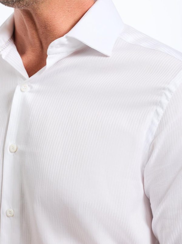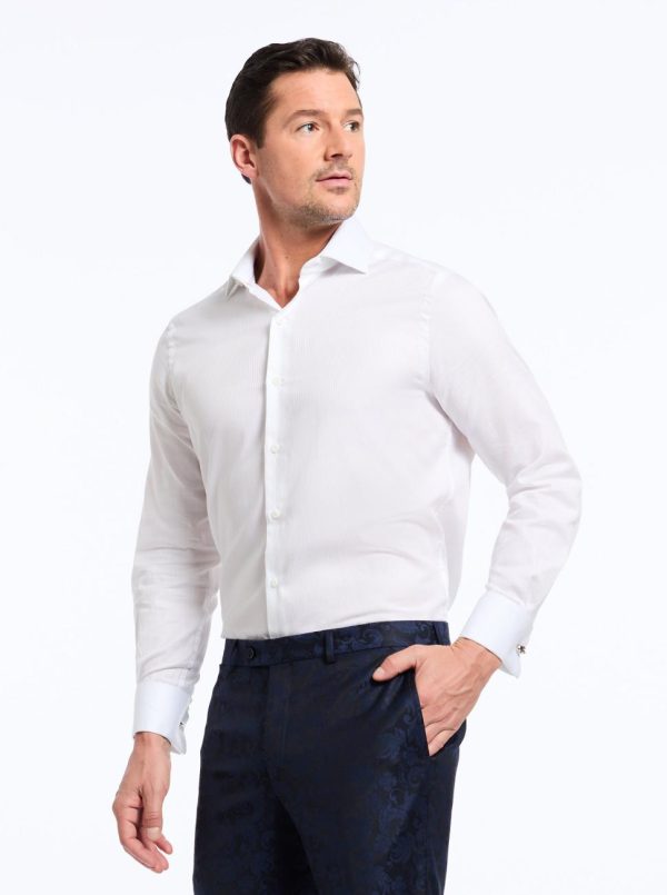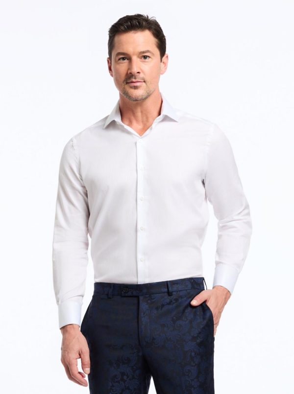 Elevate your black-tie look with this tailored white button-down shirt featuring subtle tonal stripes. Crafted for both sophistication and comfort, the refined design ensures a polished look whether worn beneath your tuxedo jacket or as a standalone statement piece. Add unexpected flair with a Robert Graham skull cufflink for a touch of distinctive personality.