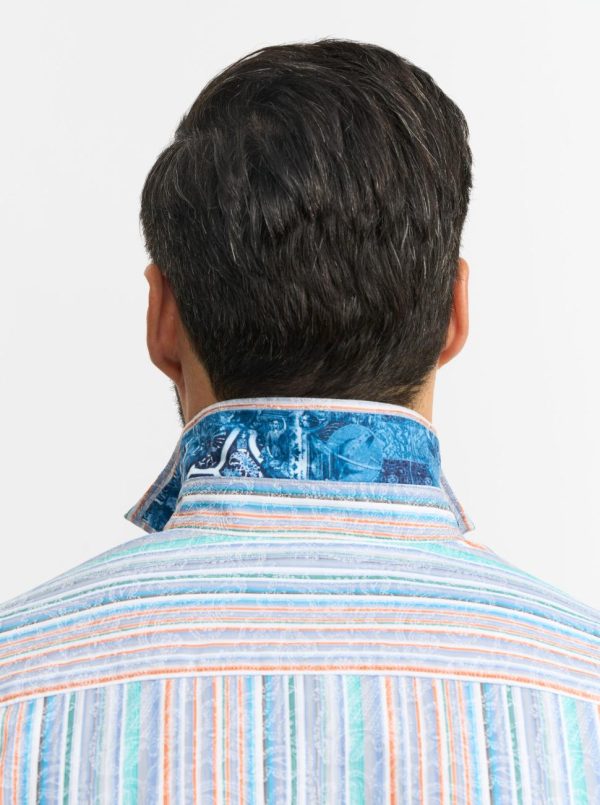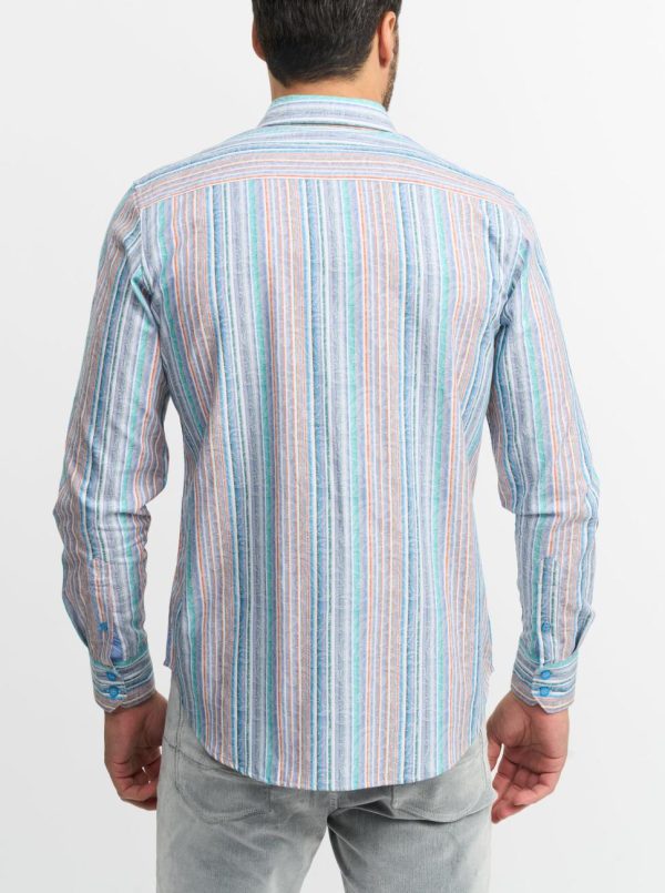 A jacquard stripe yarn dye cotton is a winning combination. Notice the subtle paisleys peeking through in the background. Pair with dark wash denim to complete the look.