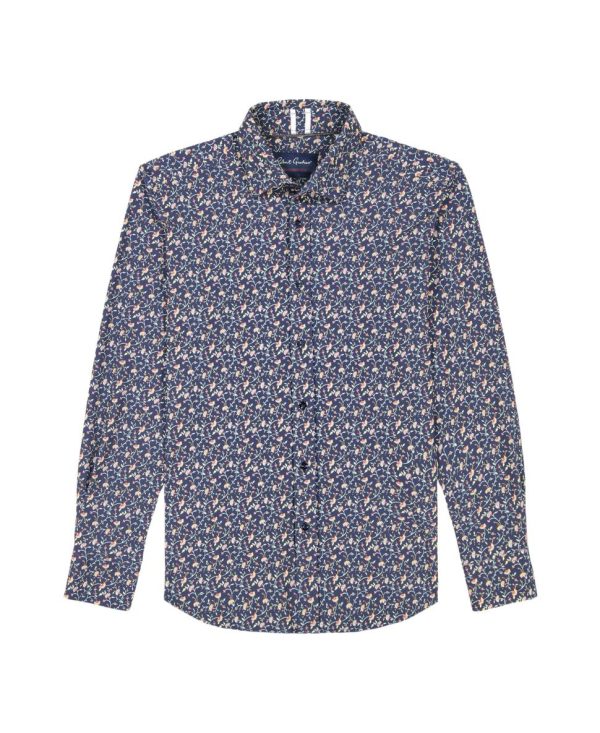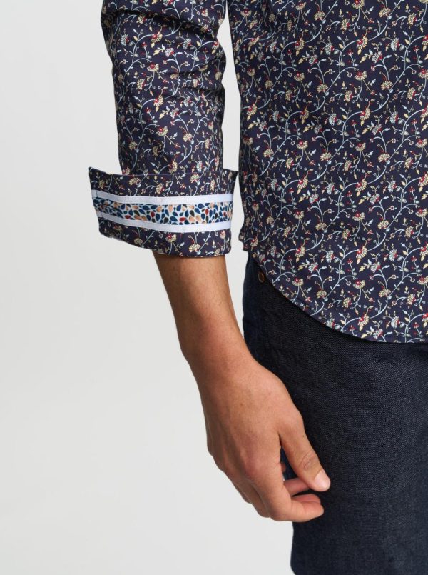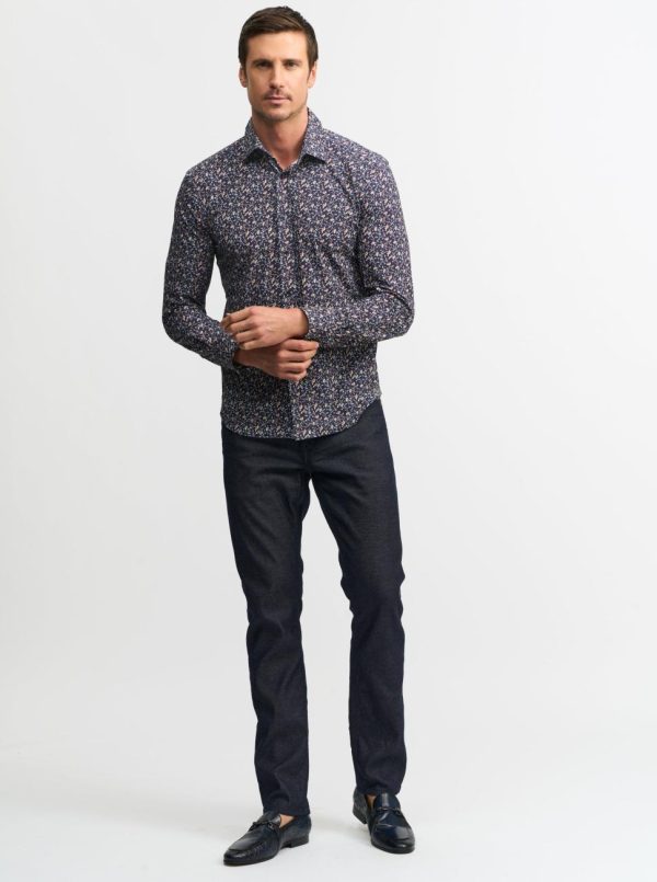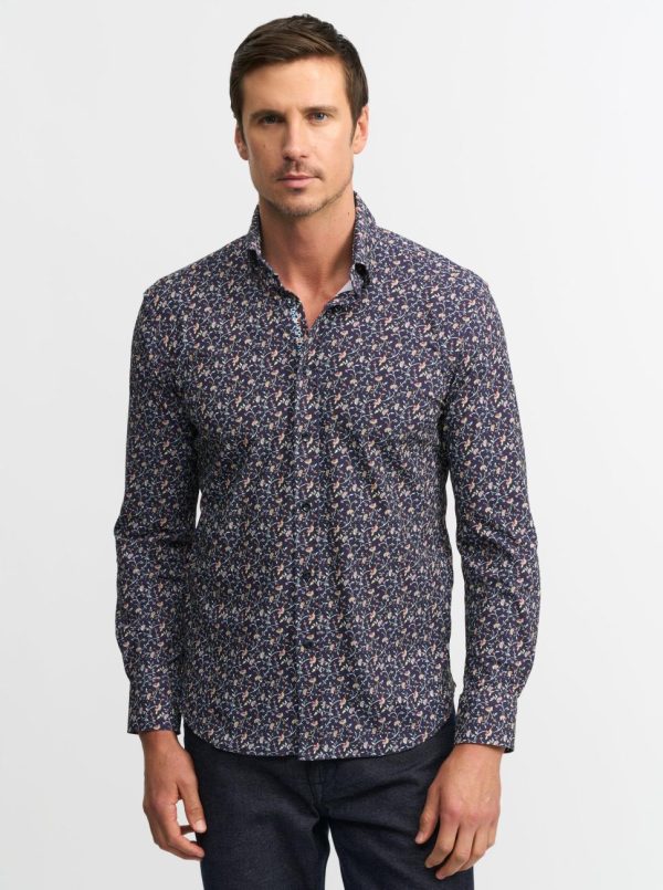Swap out your standard blue button down for this updated take. Notice the floral vines that add visual interest. Wear solo or layer under your favorite blazer. You’ll love the easy stretch of this classic style in our knit motion nylon fabric.