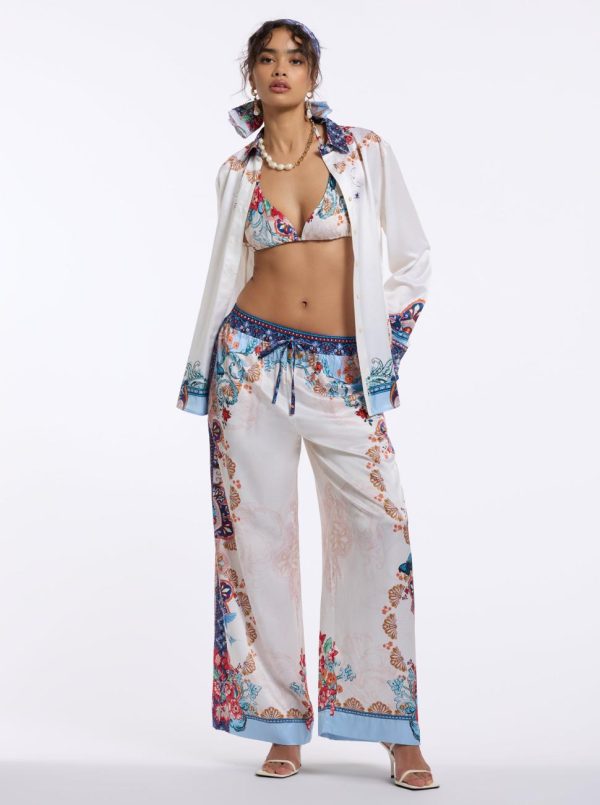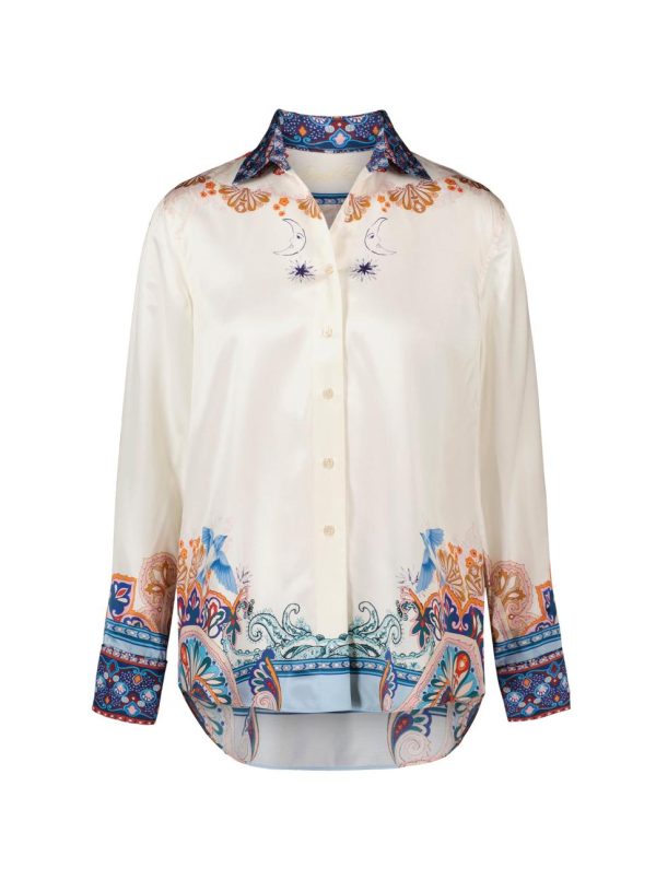 Take a silky trip this season with our Carrie. Soaring birds singing from day to night give this top an RG storytelling detail. Contrast piping at the collar and cuff add the final touches.