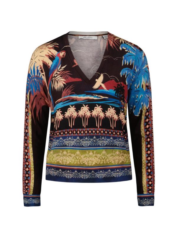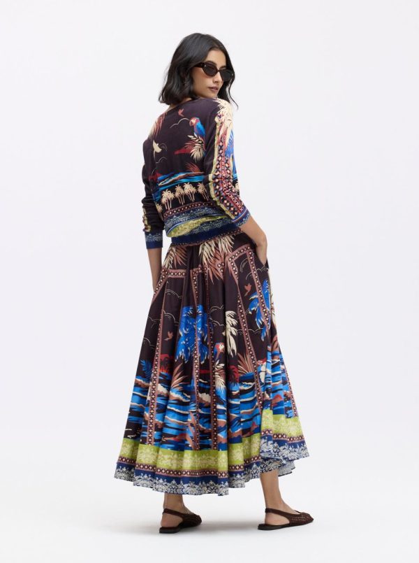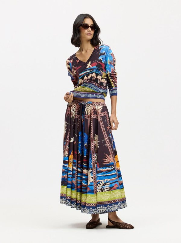 The Evelyn sweater is a wardrobe staple. With a deep v-neck, this lightweight top is sophisticated yet completely versatile. The moody sunset beach scene turns up the volume on a classic style. Pair with the matching Skylar skirt for a winning head-to-toe look.
