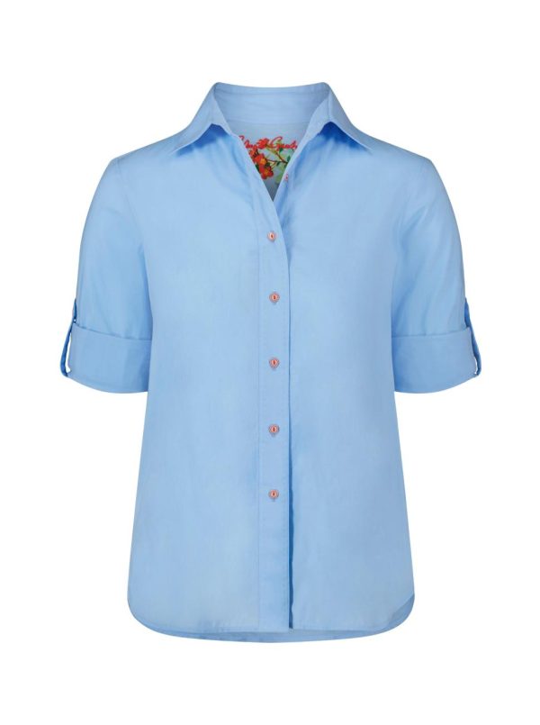 This button down in breathable linen adds a fun spin to a basic style. Turn around and admire the view of a chateau while sipping wine in the vineyard. A wreath of florals and sculpted cherubs create a beautiful visual frame. Contrast embroidery at the collar and side seams adds unexpected detail. Don’t miss the floral embroidery at the inside yoke.