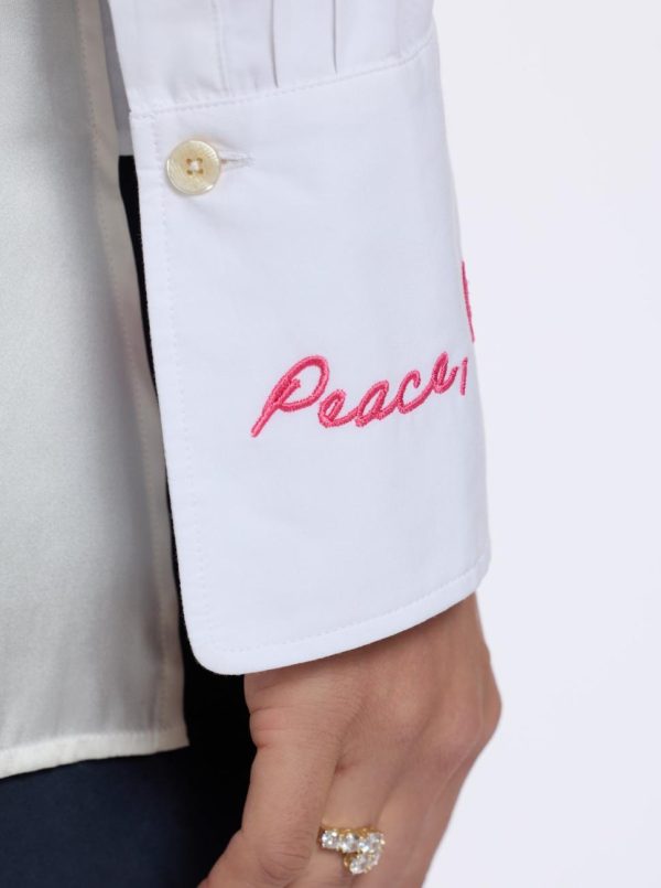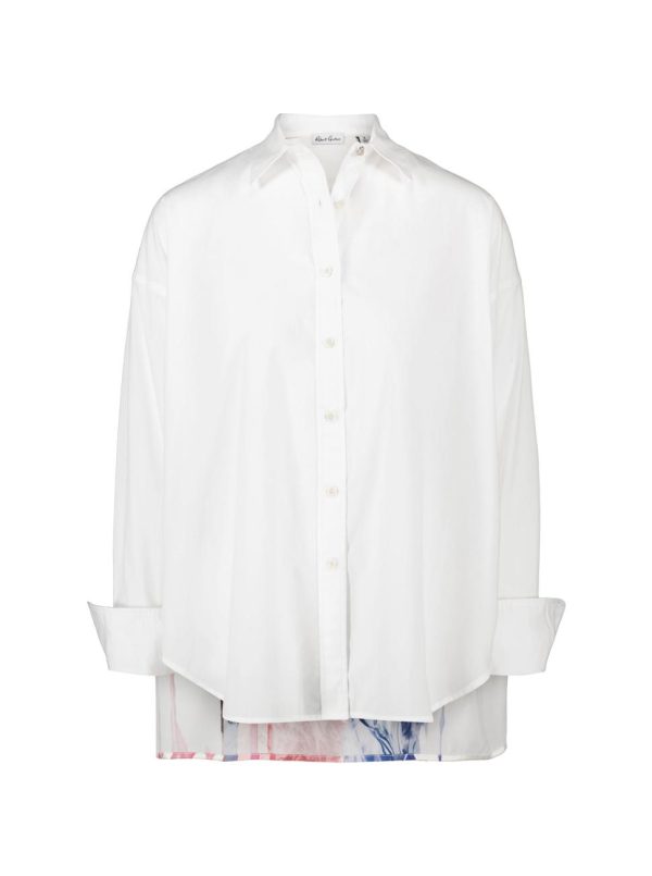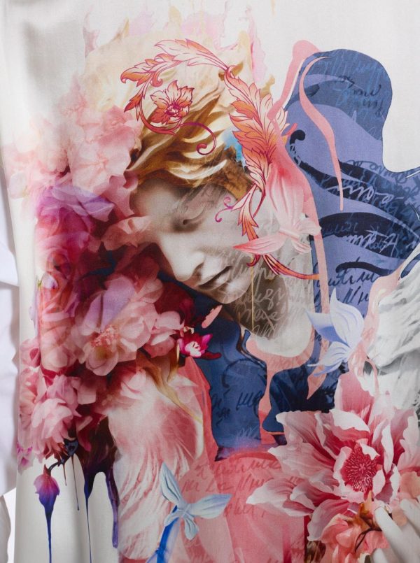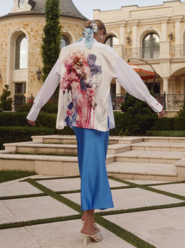 A classic white button down becomes so much more with the Sienna shirt. The surprise silky back is a canvas for an artistic masterpiece. Notice the marble statue that’s dripping in bold paint and romantic florals. Pair with pants or a skirt and be prepared to turn heads at your next event.
